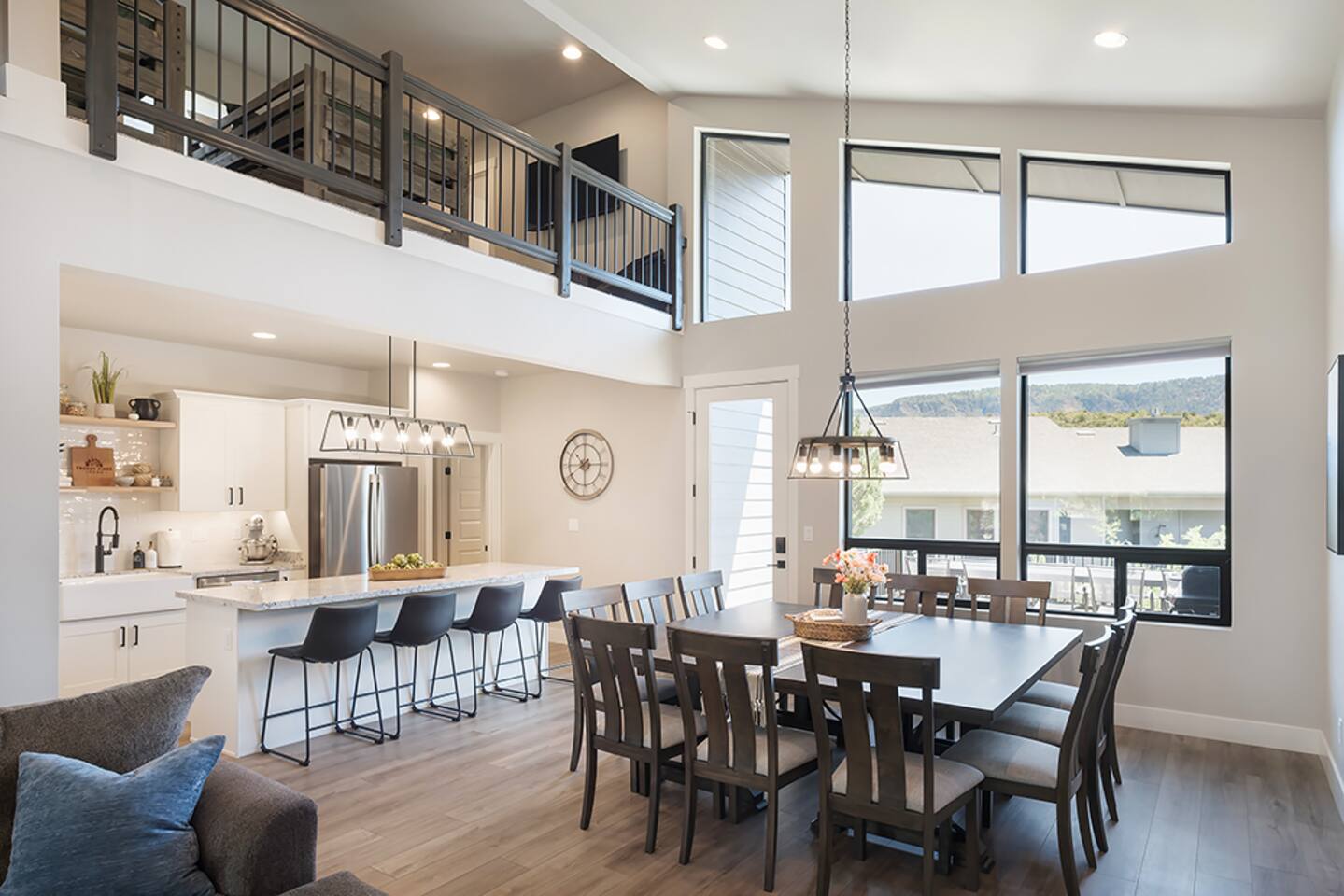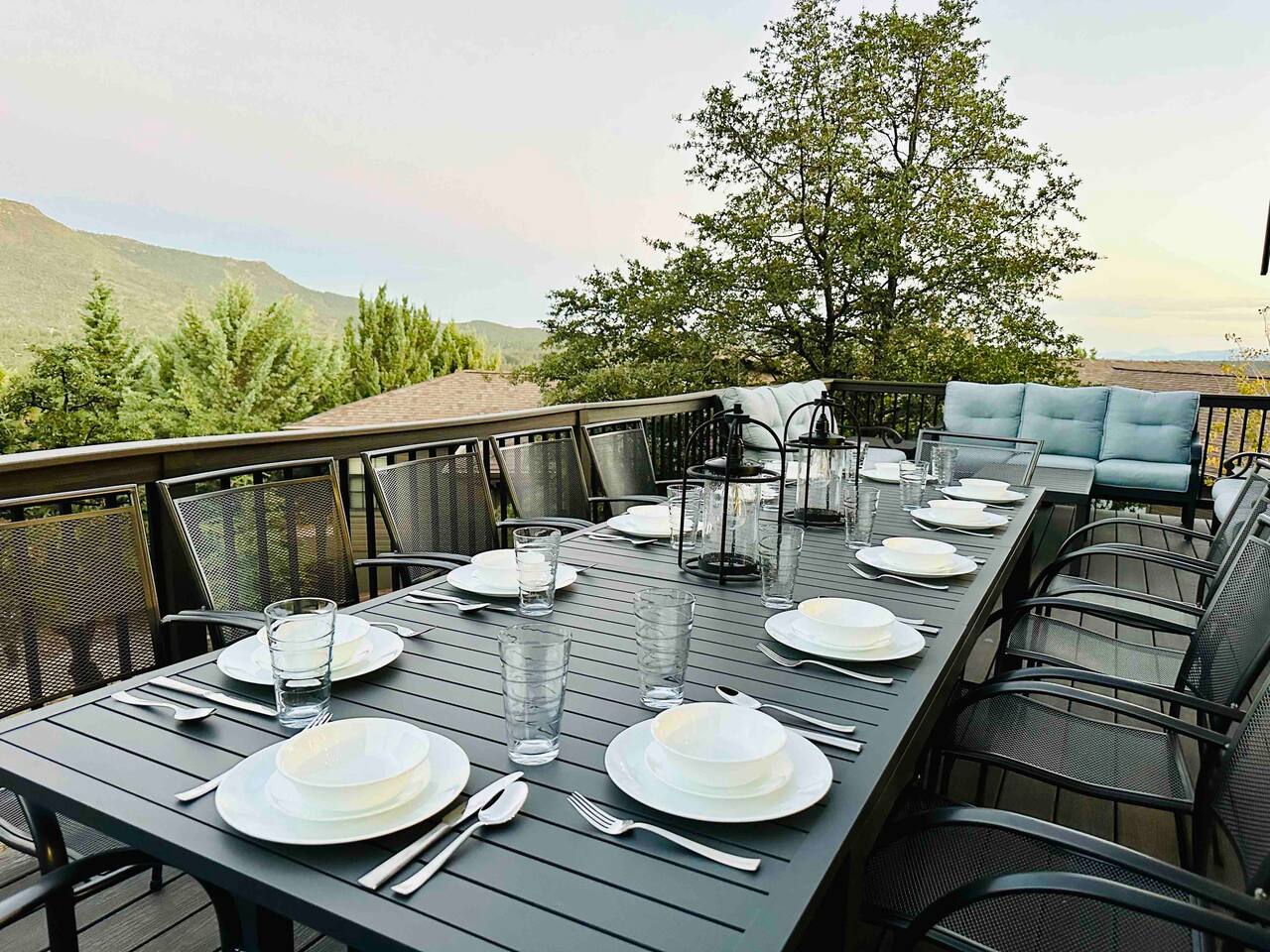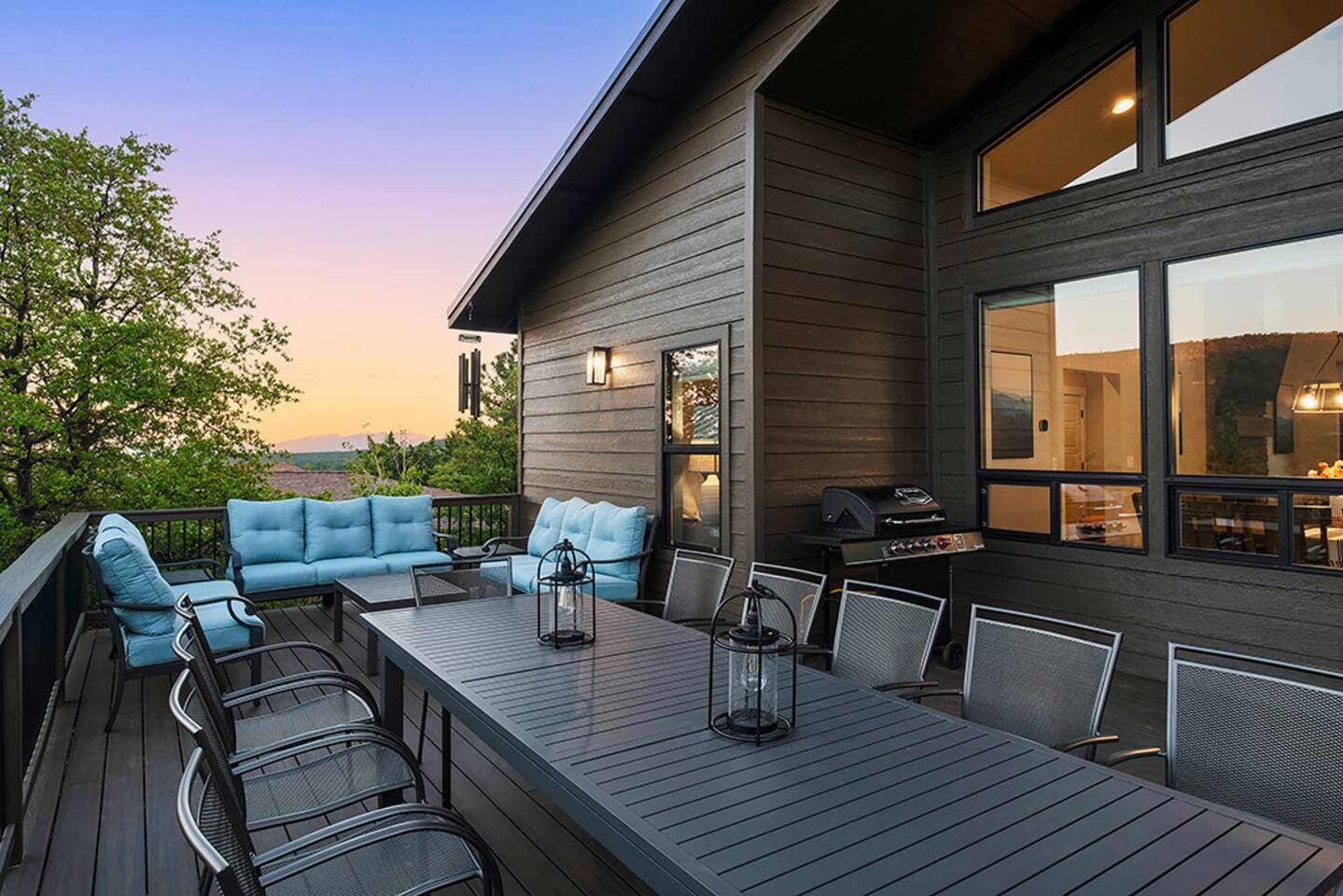 Trendy Pines Lodge is a stunning cabin retreat built in 2023 perfect for your next getaway! This spacious haven boasts 4 bedrooms (1 king, 3 queens) each equipped with Roku TVs and ceiling fans. Additionally, there is a loft bunkroom with 3 full-size bunk beds and a Roku TV and beanbag chairs. Along with 4 bathrooms, this cabin comfortably accommodates large groups or families. The living room features a gas fireplace, large ceiling fan, cozy L-shaped couch, and a 65" Roku TV with soundbar and subwoofer, ensuring everyone's comfort and entertainment. The inviting dining room seats 12, while the kitchen island offers additional seating for 4. A well-stocked kitchen provides everything you need to prepare and serve meals for your entire party. Step outside to the large back deck overlooking Pine Valley and the mountains surrounding it. Enjoy dining at the outdoor table for 12, or relax on the couches on the back deck, marveling at daytime views or star-filled nights. The front deck features rocking chairs for additional relaxation. Trendy Pines Lodge is the perfect setting for memorable gatherings, where you can experience the best of Pine, Arizona in luxurious comfort.