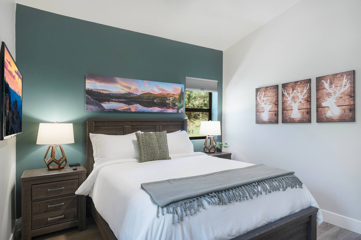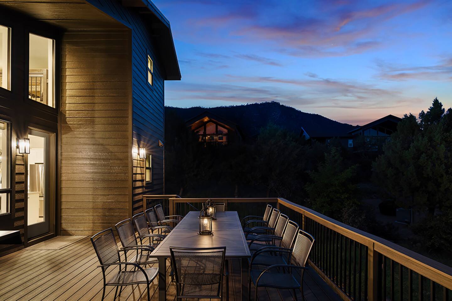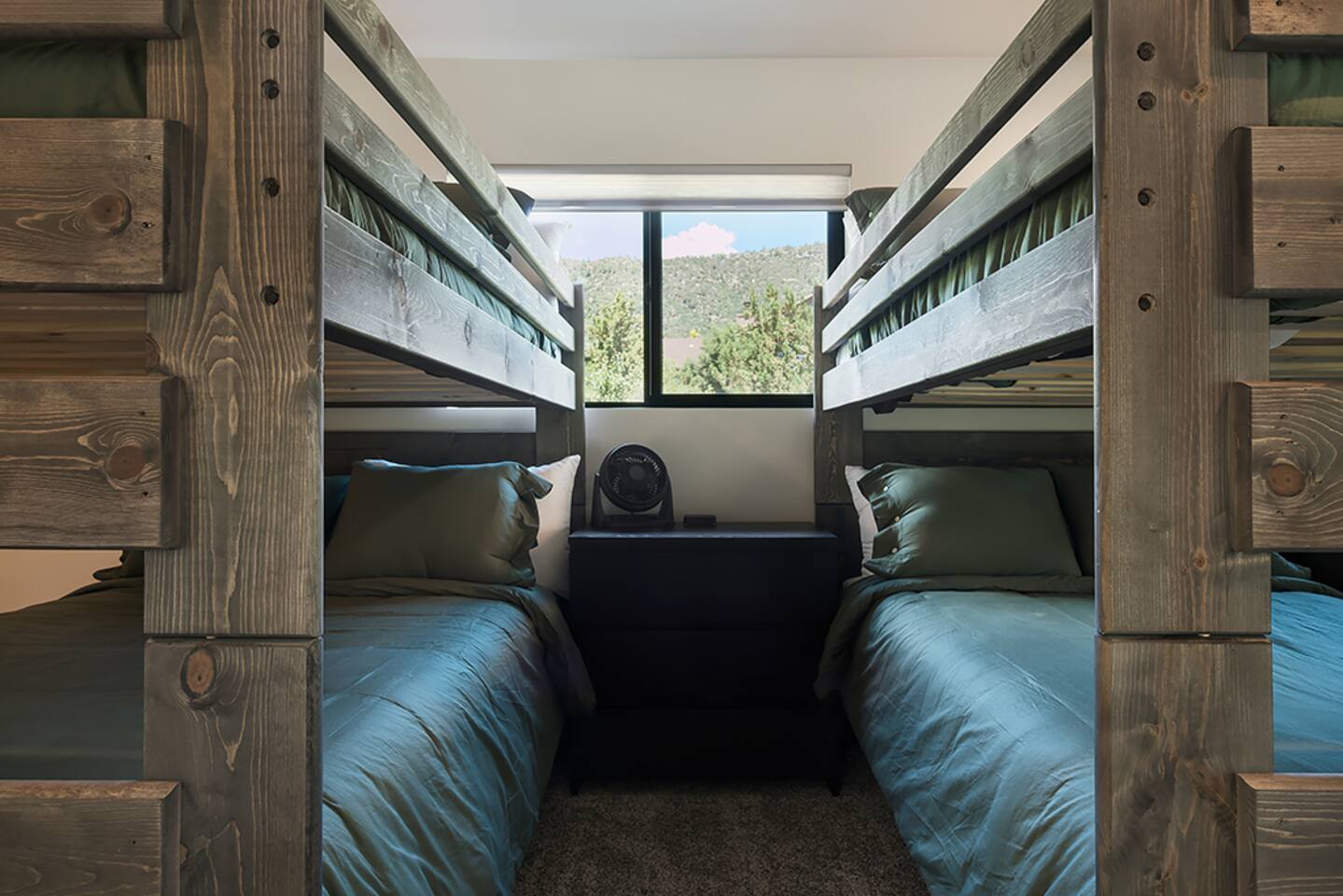 Trendy Pines Lodge is a stunning cabin retreat built in 2023 perfect for your next getaway! This spacious haven boasts 4 bedrooms (1 king, 3 queens) each equipped with Roku TVs and ceiling fans. Additionally, there is a loft bunkroom with 3 full-size bunk beds and a Roku TV and beanbag chairs. Along with 4 bathrooms, this cabin comfortably accommodates large groups or families. The living room features a gas fireplace, large ceiling fan, cozy L-shaped couch, and a 65" Roku TV with soundbar and subwoofer, ensuring everyone's comfort and entertainment. The inviting dining room seats 12, while the kitchen island offers additional seating for 4. A well-stocked kitchen provides everything you need to prepare and serve meals for your entire party. Step outside to the large back deck overlooking Pine Valley and the mountains surrounding it. Enjoy dining at the outdoor table for 12, or relax on the couches on the back deck, marveling at daytime views or star-filled nights. The front deck features rocking chairs for additional relaxation. Trendy Pines Lodge is the perfect setting for memorable gatherings, where you can experience the best of Pine, Arizona in luxurious comfort.